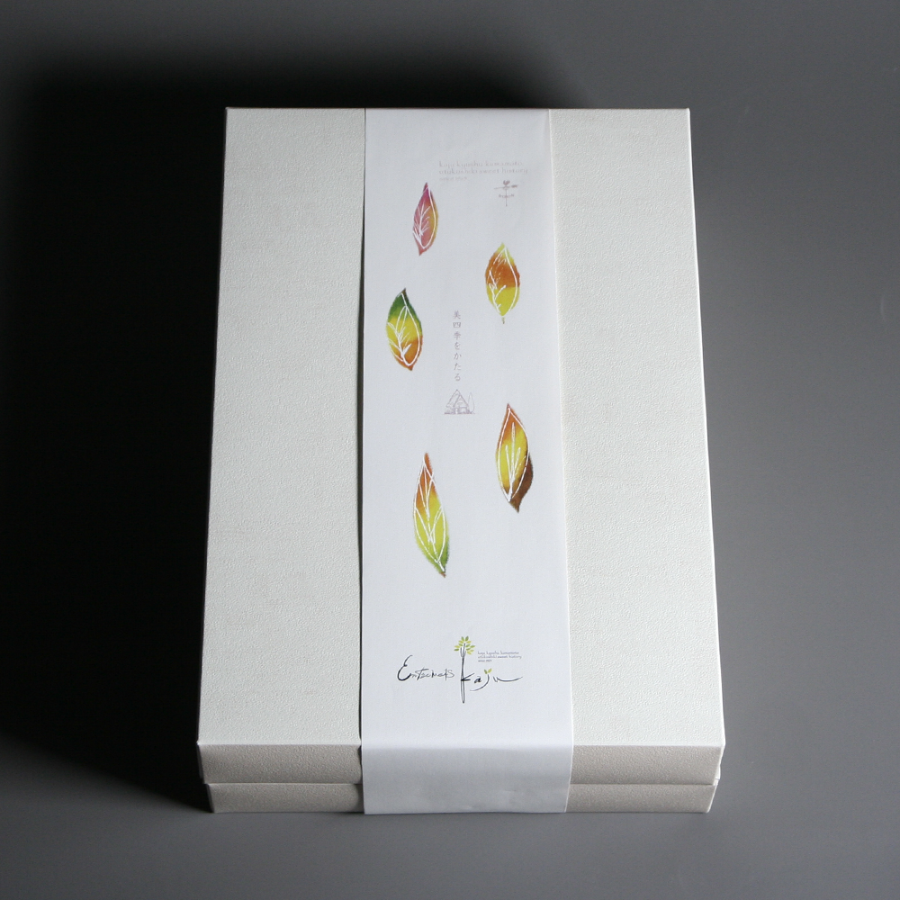 ギフトボックスには、季節に応じた菓樹オリジナルデザインの帯をかけて包装紙でお包みします。