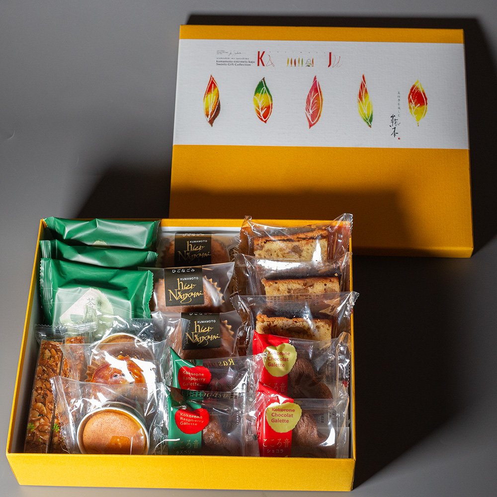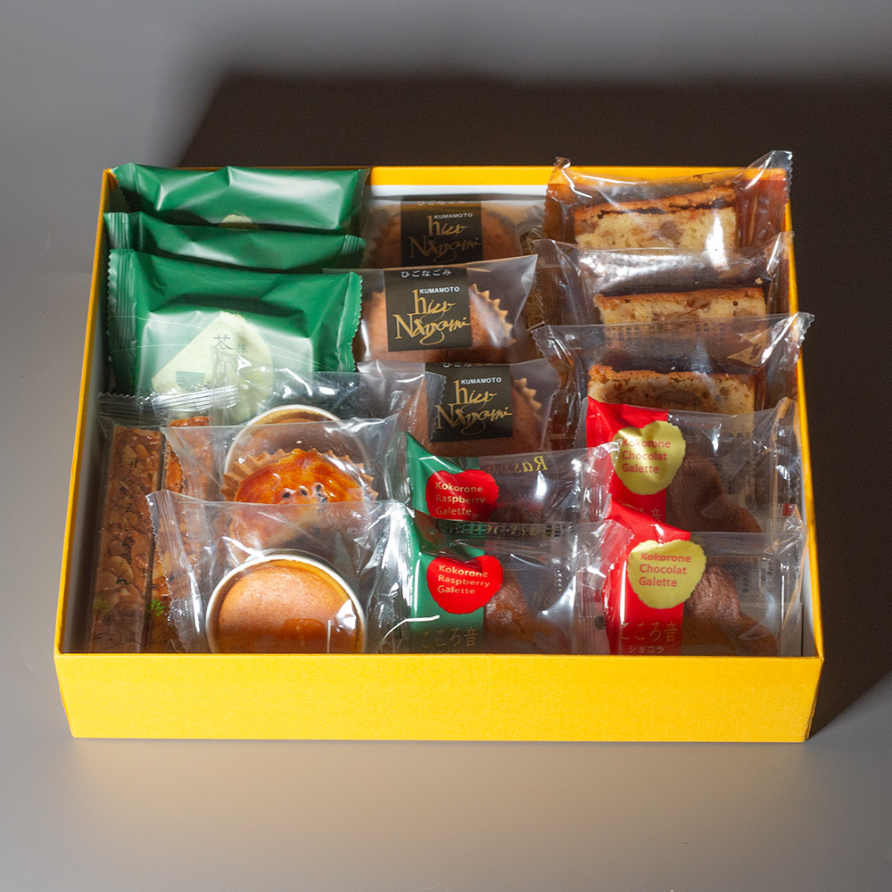 秋の風を運んでくれる「アルザス」「マロンケーキ」「西原スイートポテト」、菓樹といえばの「ふろらんたん」「こころ音ショコラ」など、人気の焼菓子を詰め合わせた20個入りのギフトセット。