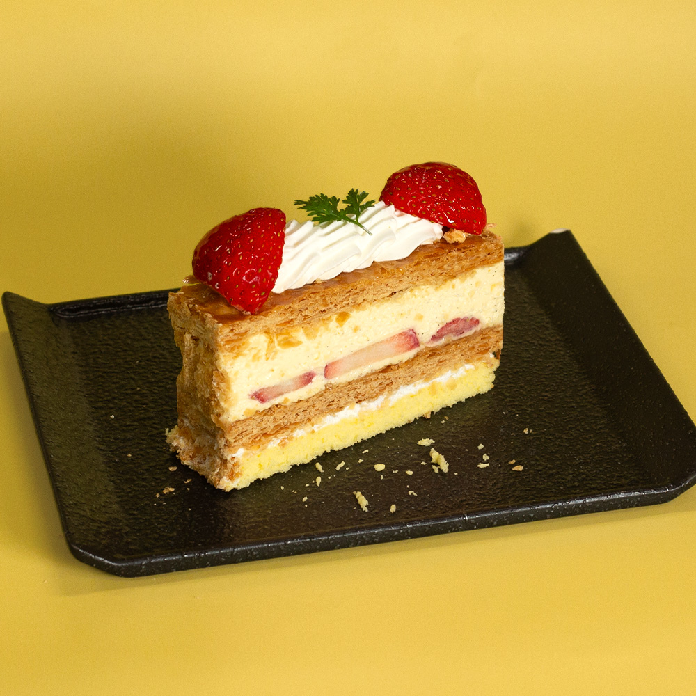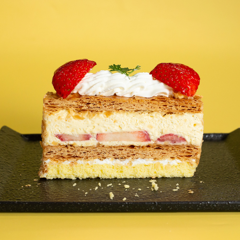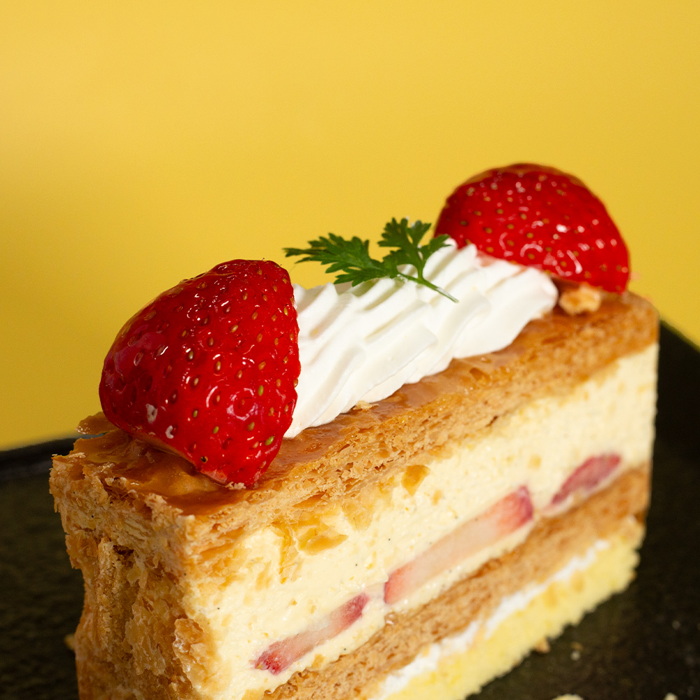 フィユタージュ・アンヴェルセという、通常のパイ生地よりふんだんにバターを加え難易度の高い製法で作られた、バターの香り高く繊細な食感のパイを使用。そこにコクのあるカスタードクリームと、程よい酸味のあるフレッシュな苺をサンド。まるで王宮などの高貴な場所で出されるスイーツのような、他ではなかなか味わえない贅沢なミルフィーユです。ロイヤルミルクティーを淹れてみたりしてリッチなティータイムをお楽しみください。