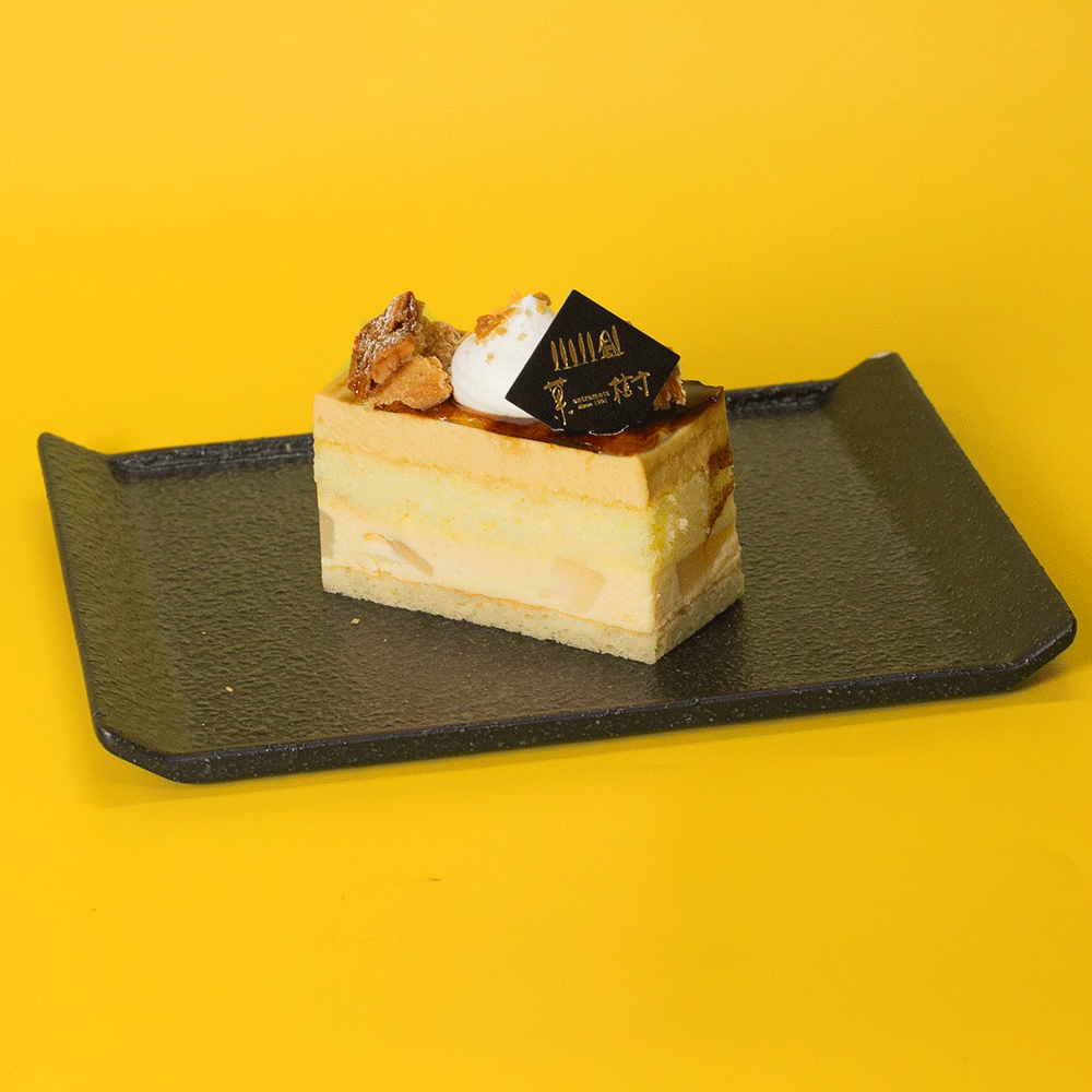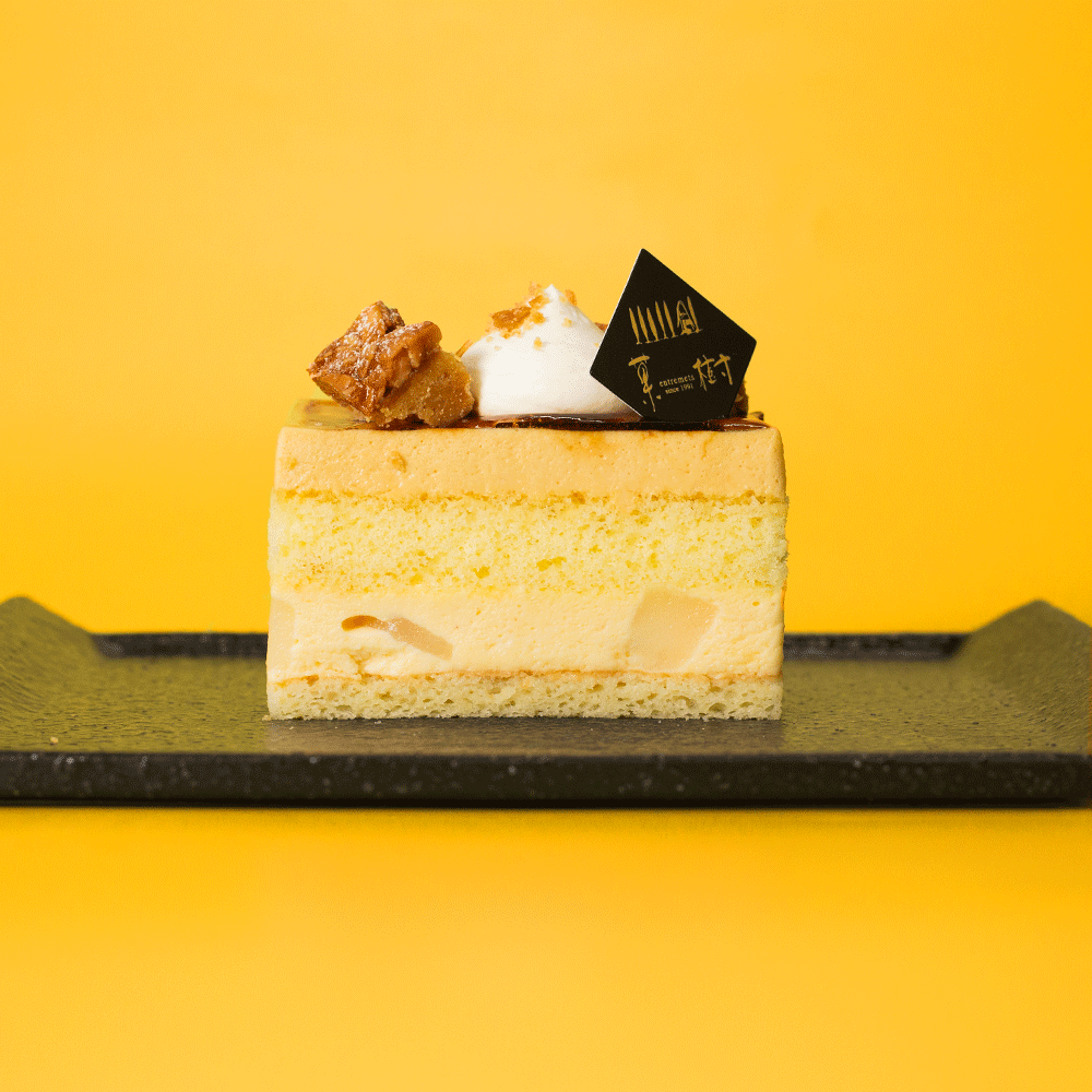 甘く煮込んだ洋梨を刻み、洋梨ムースの中に閉じ込めました。上のキャラメルムースは、焦がしたカラメルのほろ苦さがあり、洋梨との相性が抜群!刻んだ洋梨がアクセントになり、キャラメルケーキが得意でない方でも食べやすい味です。 菓樹の秋定番ケーキのひとつで、実は毎年の販売を心待ちにしているスタッフも……ぜひご賞味ください。
