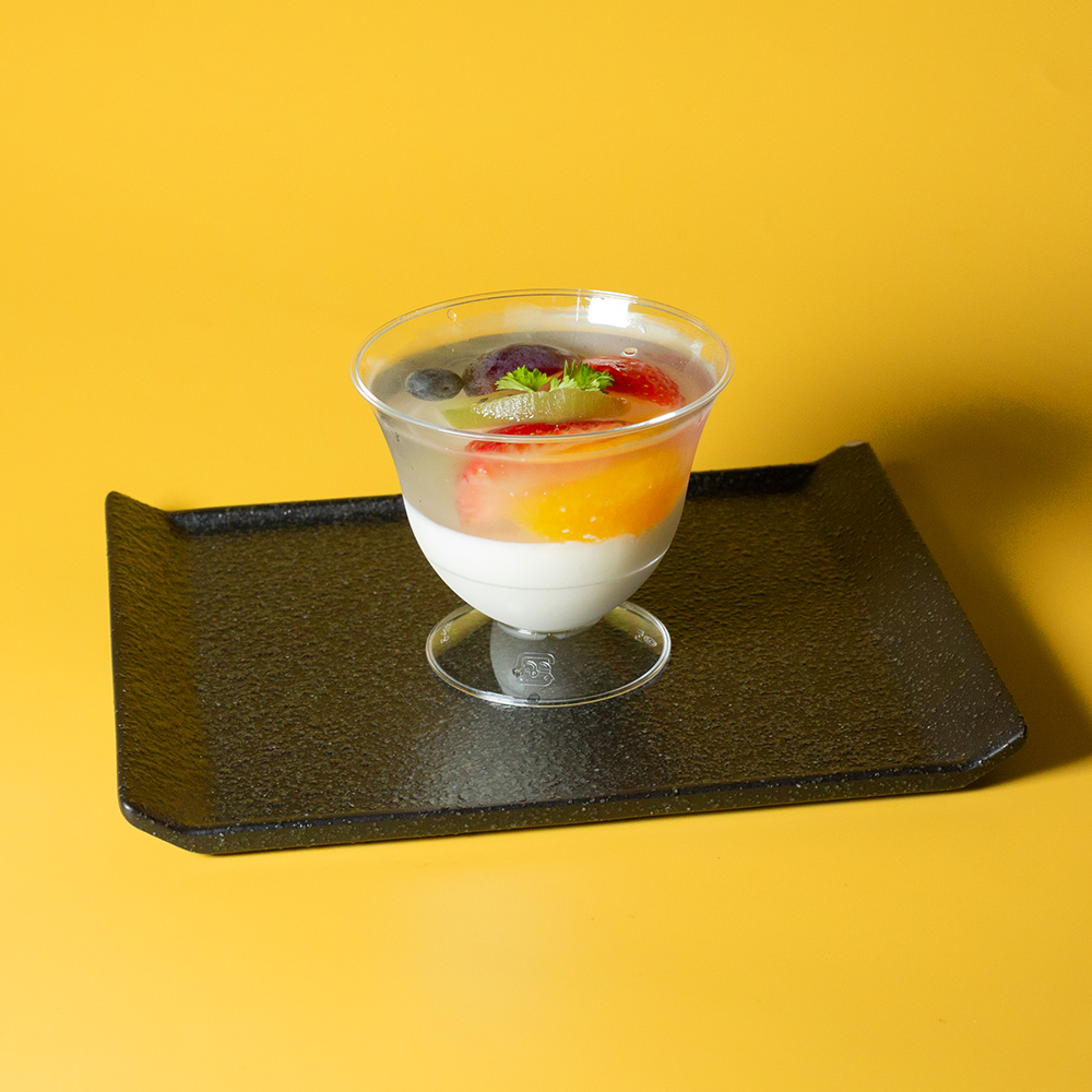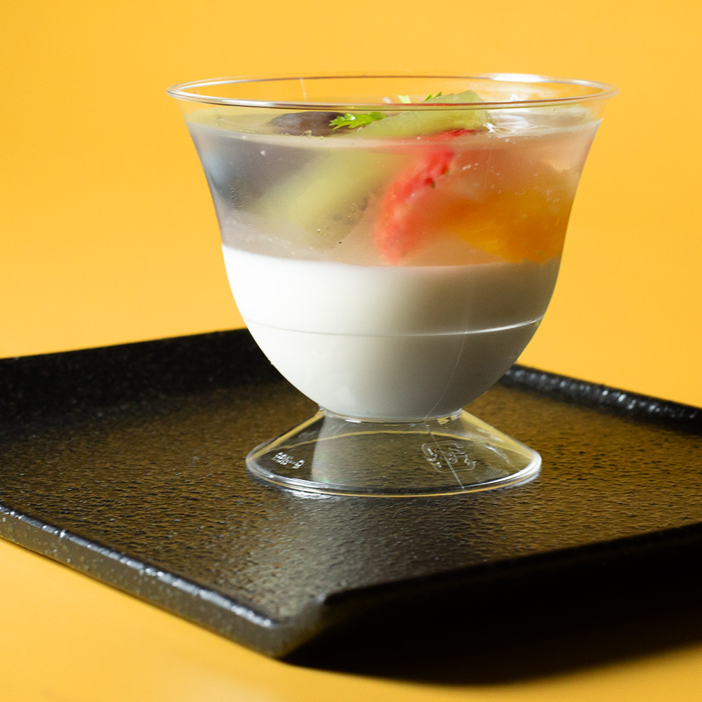優しい味わいのなめらか杏仁と、コアントローで香りづけた透き通るジュレの二層仕立て。 杏仁は特有の香りを控えめにしており、苦手な方でも食べやすい風味です。ジュレの中には苺、ブルーベリー、オレンジ、キウイ、ぶどうをしのばせました。 つるんと食べやすく、さっぱりとした一品。手土産や差し入れとしてもおすすめです。