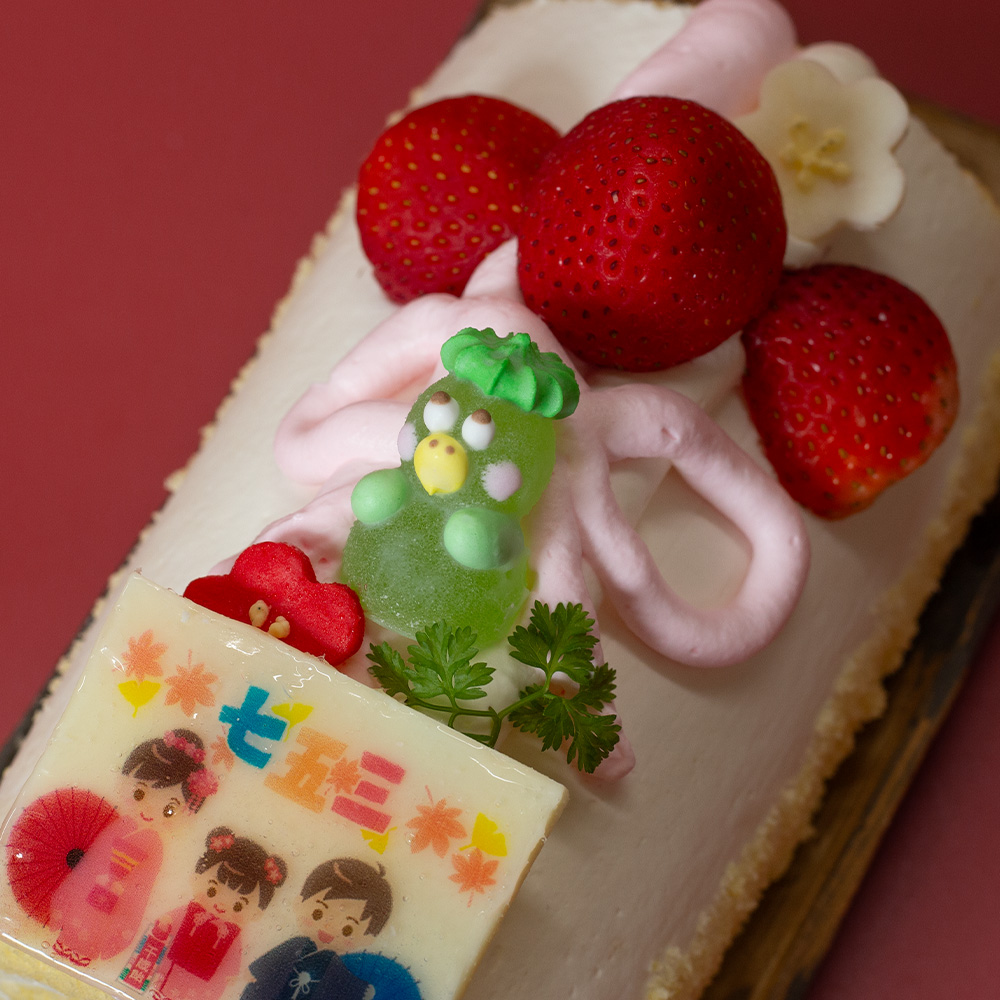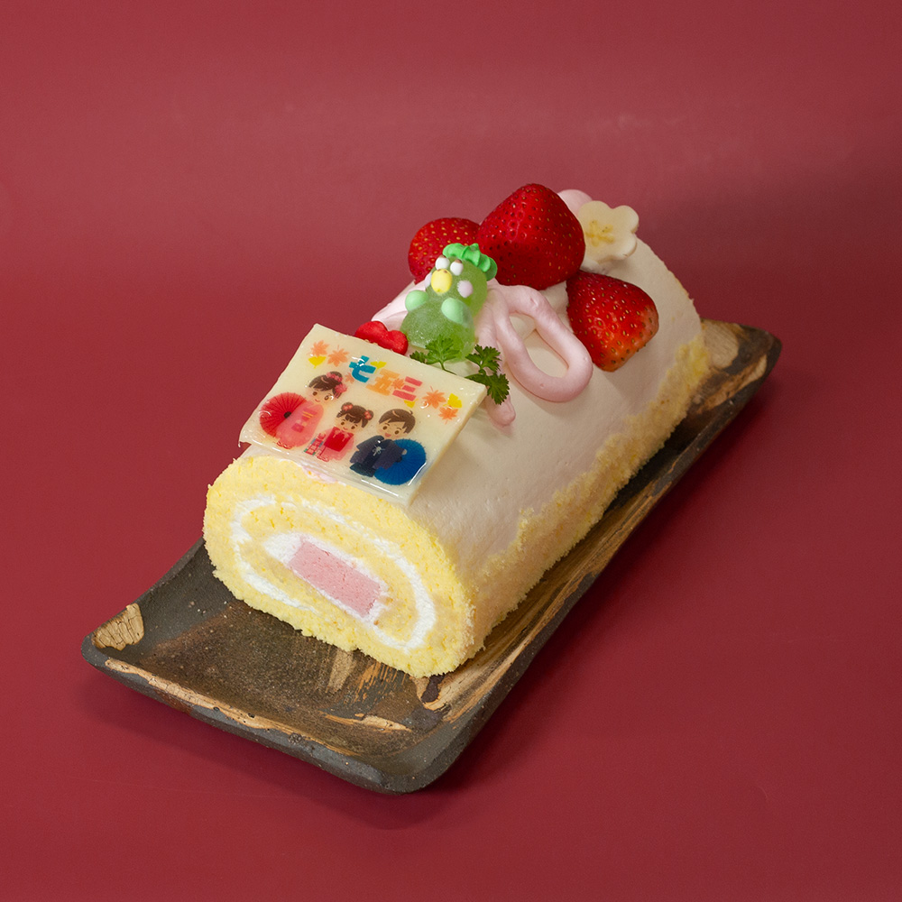 お子様の健やかな成長を祝い、お祈りするためのケーキを、心を込めてご用意しました。 程よい酸味の苺ムースとコクのある生クリームをふわふわのスポンジで巻き、苺の練乳クリームでリボンを絞りました。ミニサイズの動物ゼリーは、数種類あります。何がのっているかはお楽しみ♪かわいらしいケーキで、お子様が喜ぶことまちがいなし。 ご家族での集まりや、お祝いとしての手土産にもぴったりです。